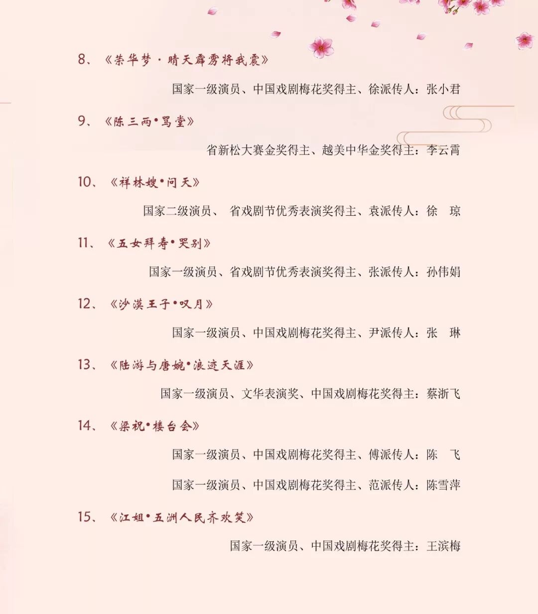 整台演出既有诗情画意、檀板清歌,又有铁板铜琵、大江东去,更有清秀典雅、气势恢宏贯穿始终。省内众多戏剧梅花奖、金桂奖、新松奖以及高级职称演员和优秀青年演员,集结一堂,名家新秀同台亮相,精彩纷呈。